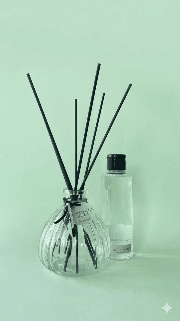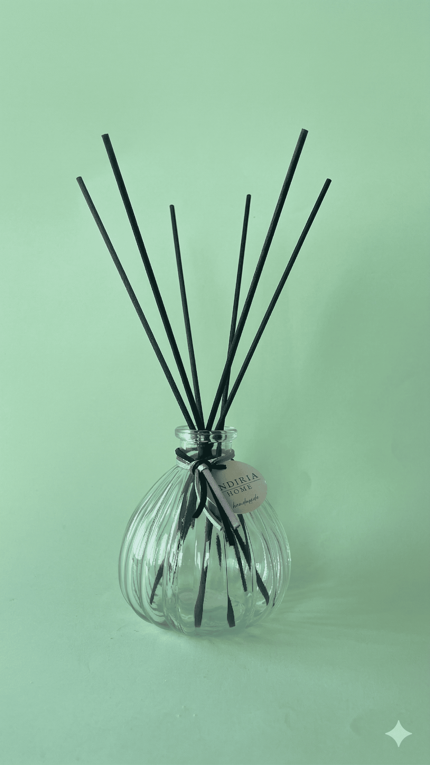 Este elegante difusor mikado, presentado en un recipiente de vidrio de diseño minimalista, está elaborado artesanalmente para ofrecer una experiencia aromática sofisticada y duradera.