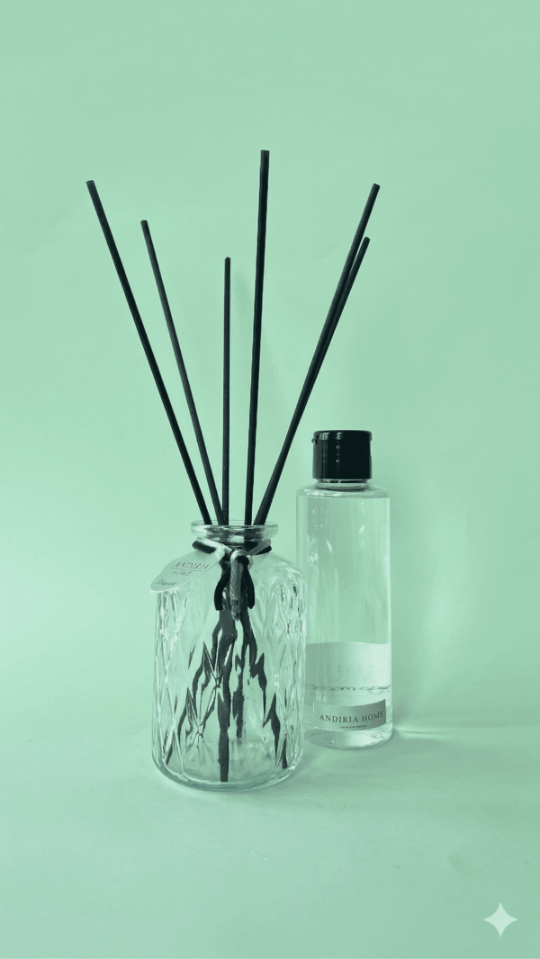 Aporta un toque de elegancia y bienestar a tu hogar con nuestro difusor mikado artesanal. Presentado en un delicado recipiente de vidrio acompañado de una botella de recarga, está diseñado para perfumar tus espacios de forma continua y sofisticada.