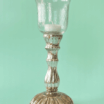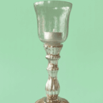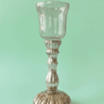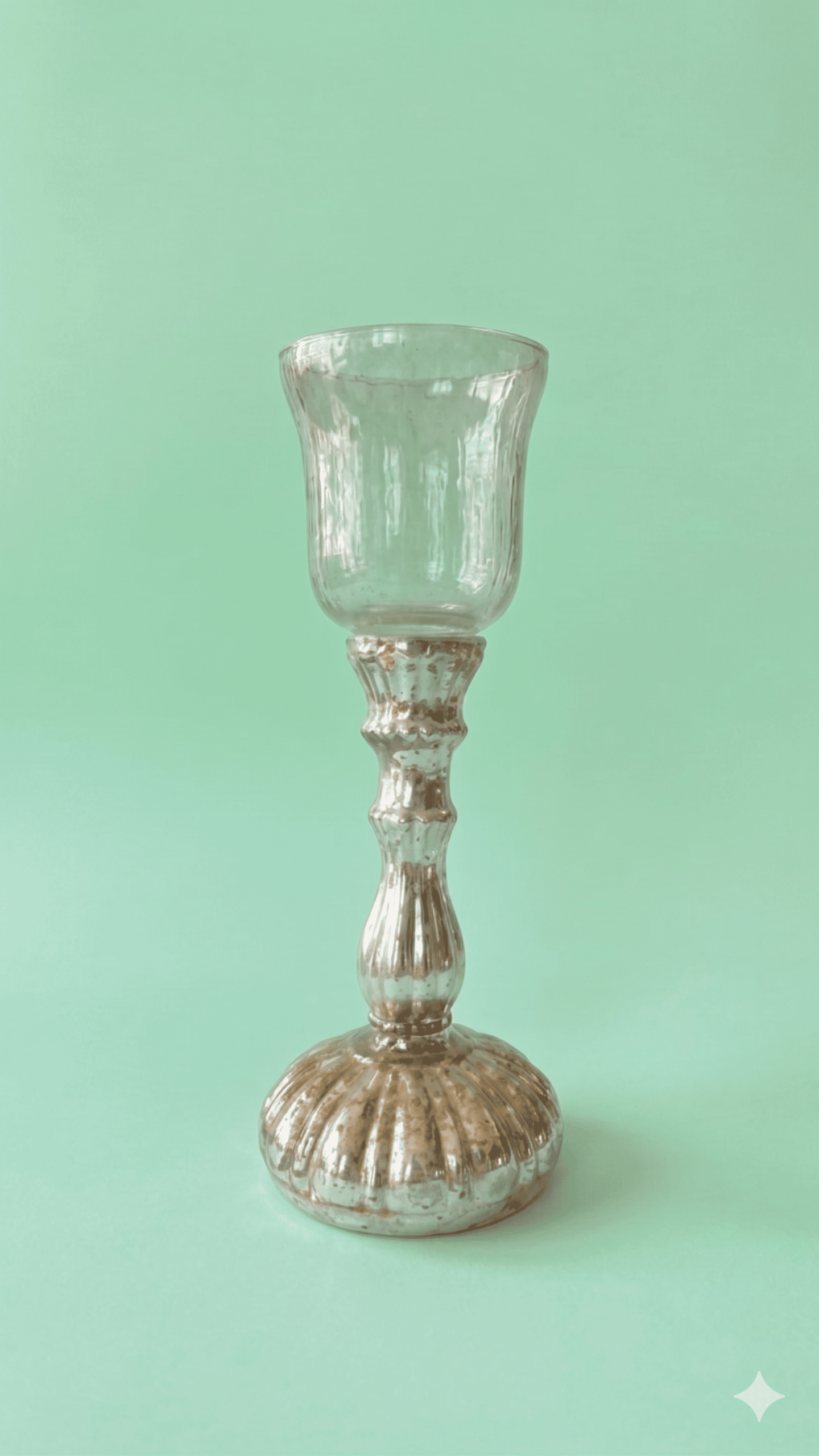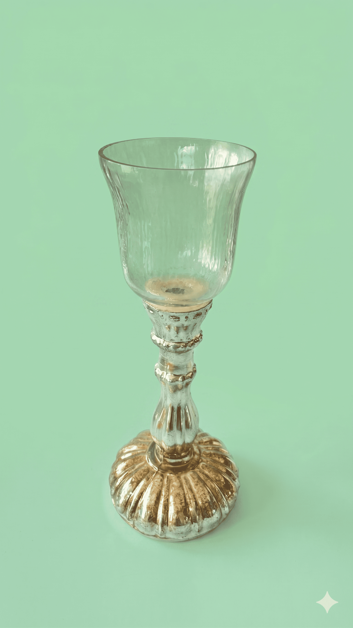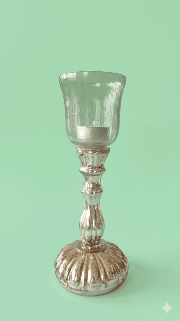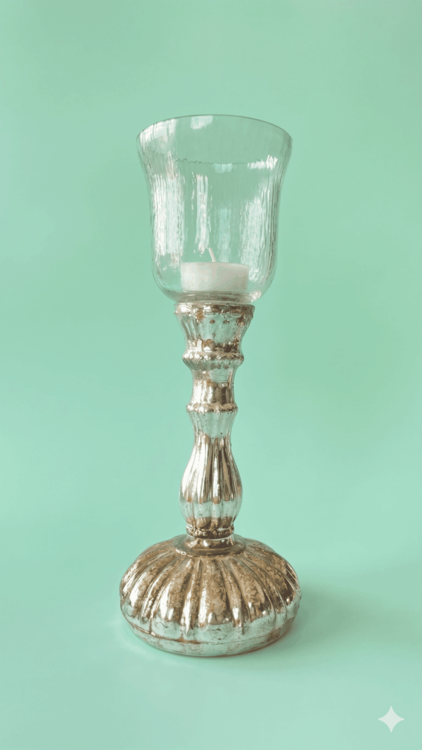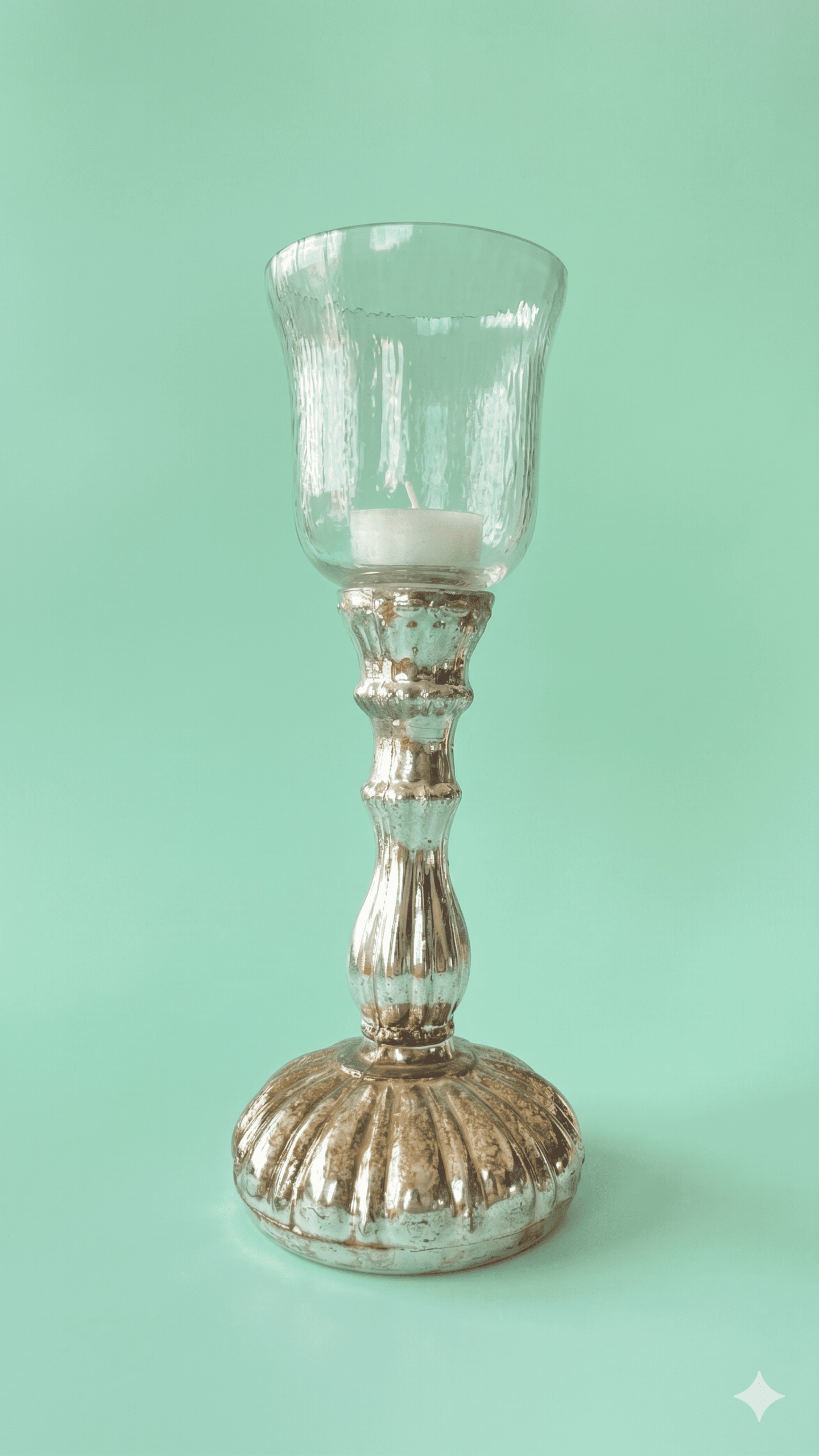 Una pieza de inspiración clásica que combina la elegancia del cristal con un acabado plateado envejecido. Su base, con efecto “mercury glass” (vidrio mercurizado), aporta un brillo moteado y artístico, mientras que la tulipa superior protege la llama y difunde la luz de manera suave y acogedora.