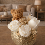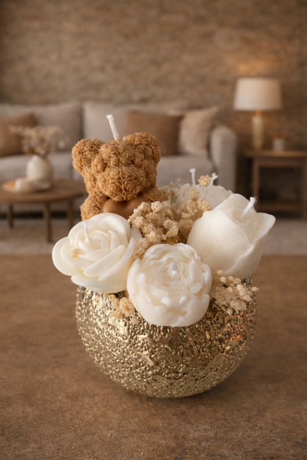 Vela decorativa artesanal elaborada con cera de soja 100% vegetal, presentada en un elegante envase de cristal dorado y decorada con flores de cera, osito de cera y flores preservadas naturales. Esta vela decorativa con flores es ideal para decorar el hogar, aportar un toque elegante o sorprender con un regalo original y especial.